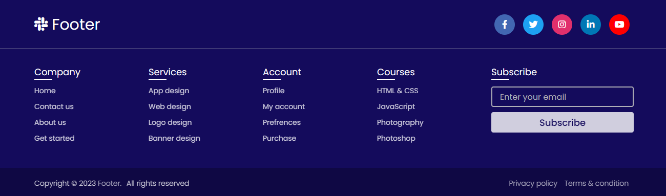 "Demonstrating my expertise in web design, I crafted a responsive footer section using HTML and CSS. This project seamlessly blends aesthetics with functionality, ensuring an engaging user experience across various devices. Explore how meticulous design and clean coding converge to enhance the overall website presentation."